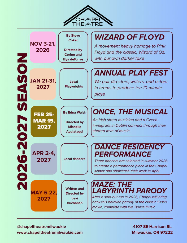 About Us 2026-27 Season Posted by chapeltheatre on April 3, 2026 See below for Chapel Theatre Co’s 2026-27 season of productions. Share this: Share on X (Opens in new window) X Share on Facebook (Opens in new window) Facebook Like Loading... Related